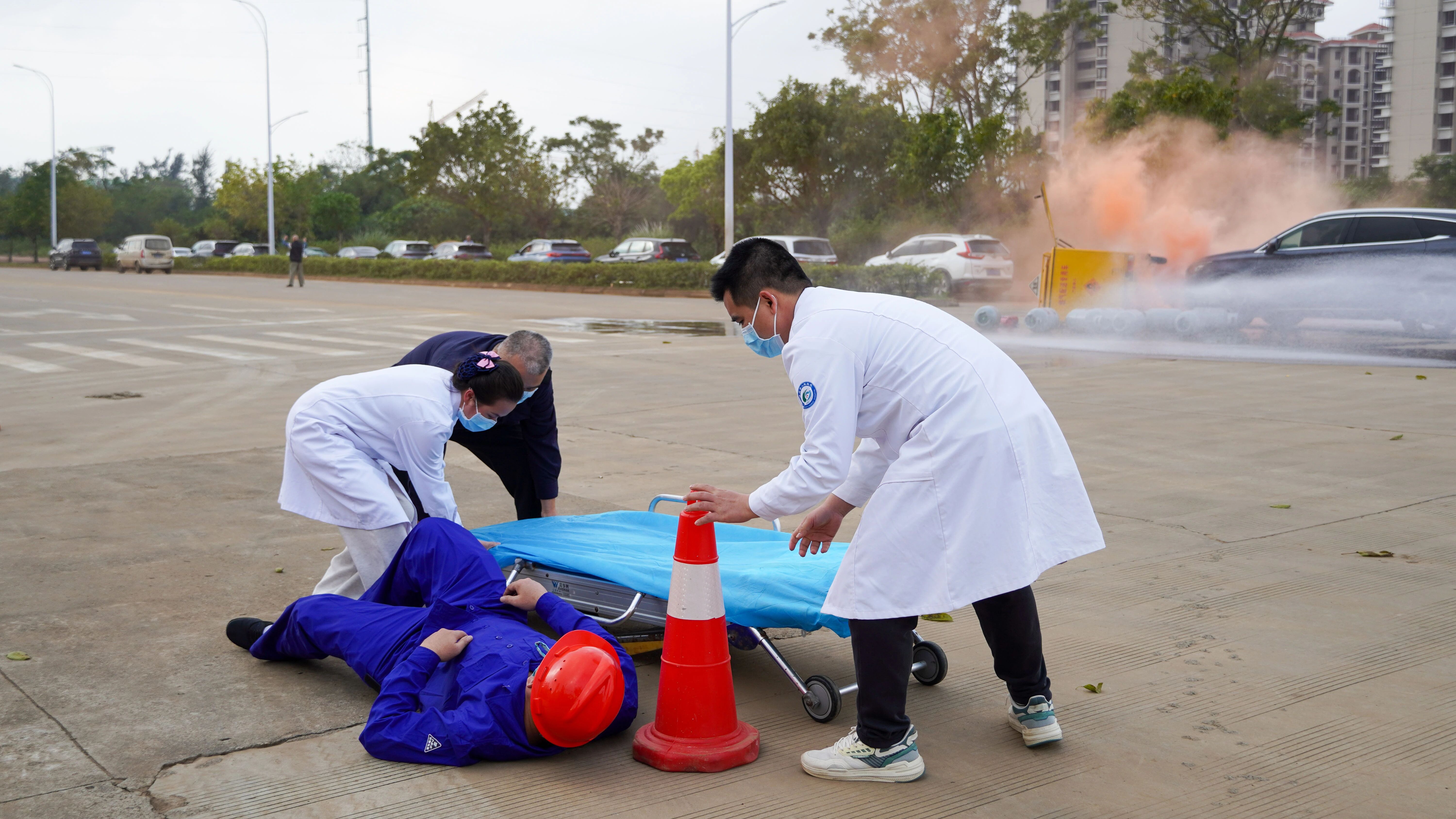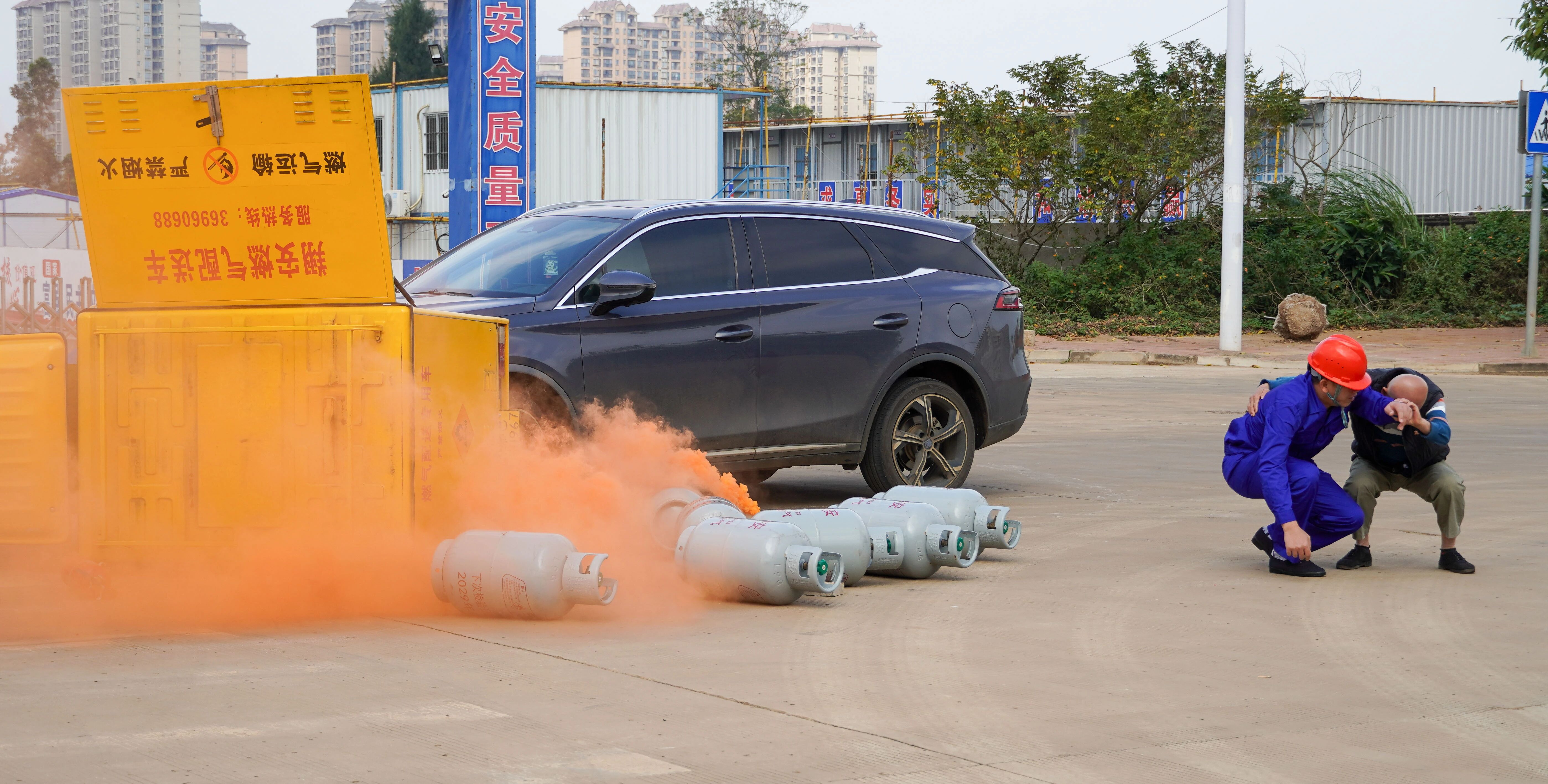本次演練模擬液化石油氣鋼瓶運送車輛因避讓車輛發生意外側翻導致燃氣泄漏,現場人員受傷場景。險情發生后,事故單位立即啟動應急響應,并上報屬地公安、消防、醫療及住建部門。